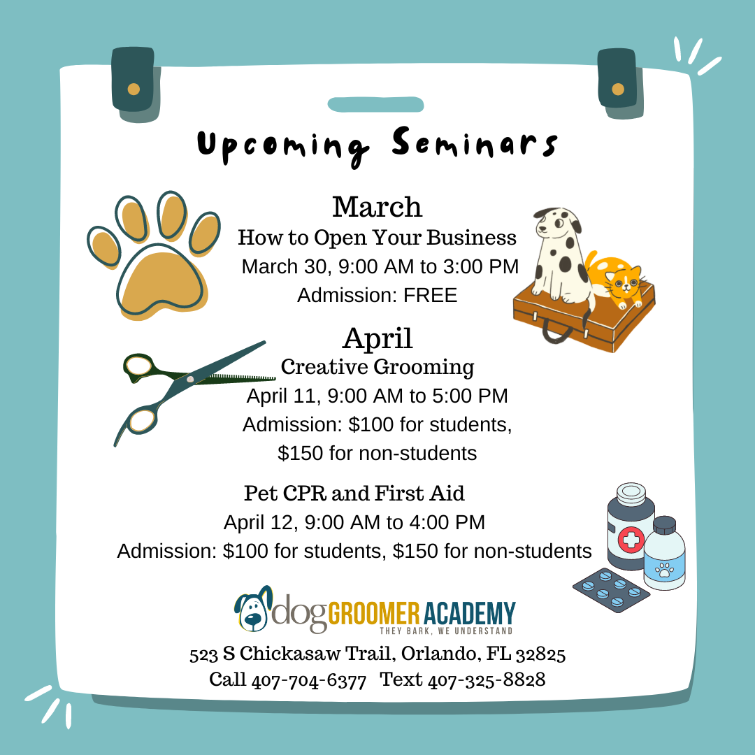 Attend our seminar to learn how to use creative grooming on animals! The seminar will start at 9:00 AM and end at 5:00 PM. The admission for this seminar is $100 for students of Dog Groomer Academy, and admission for non-students is $150. Limited space available. The Dog Groomer Academy is located at 523 S Chickasaw Tr, Orlando FL 32829. Please call us at (407) 704-6377 or text (407) 325-8828 if you have any questions. |